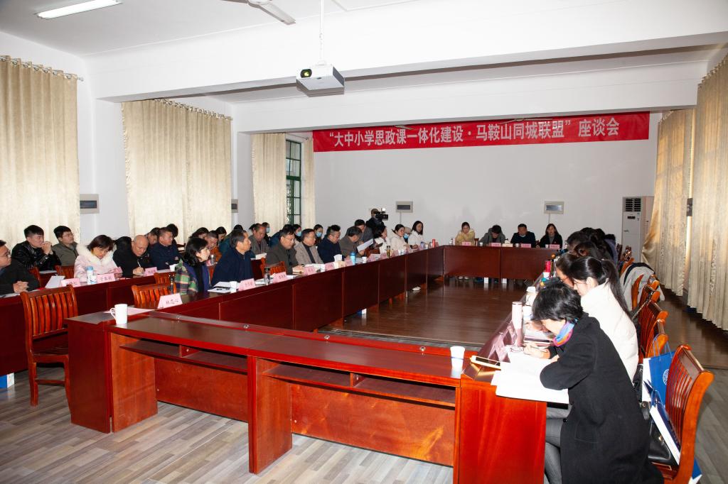 与马鞍山市教育局共同举办“大中小学思政课一体化建设·马鞍山同城联盟”座谈会,精心开展大中小学思政课教师集体备课活动,积极推进大中小学思政课一体化建设工作。来自马鞍山市教育局、在马高校以及马鞍山区县各学段中小学思政课骨干教师代表、专家和负责人以及研究生等60余人参会。