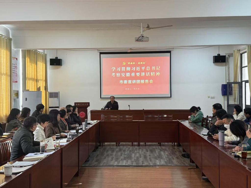 为深入学习宣传贯彻习近平总书记考察安徽重要讲话精神,11月28日,马克思主义学院在学院325报告厅举办学习贯彻习近平总书记考察安徽重要讲话精神宣讲报告会,市委讲师团倪松根老师应邀作宣讲报告。会议由学院党委书记徐惠主持,学院全体教职工出席了会议。