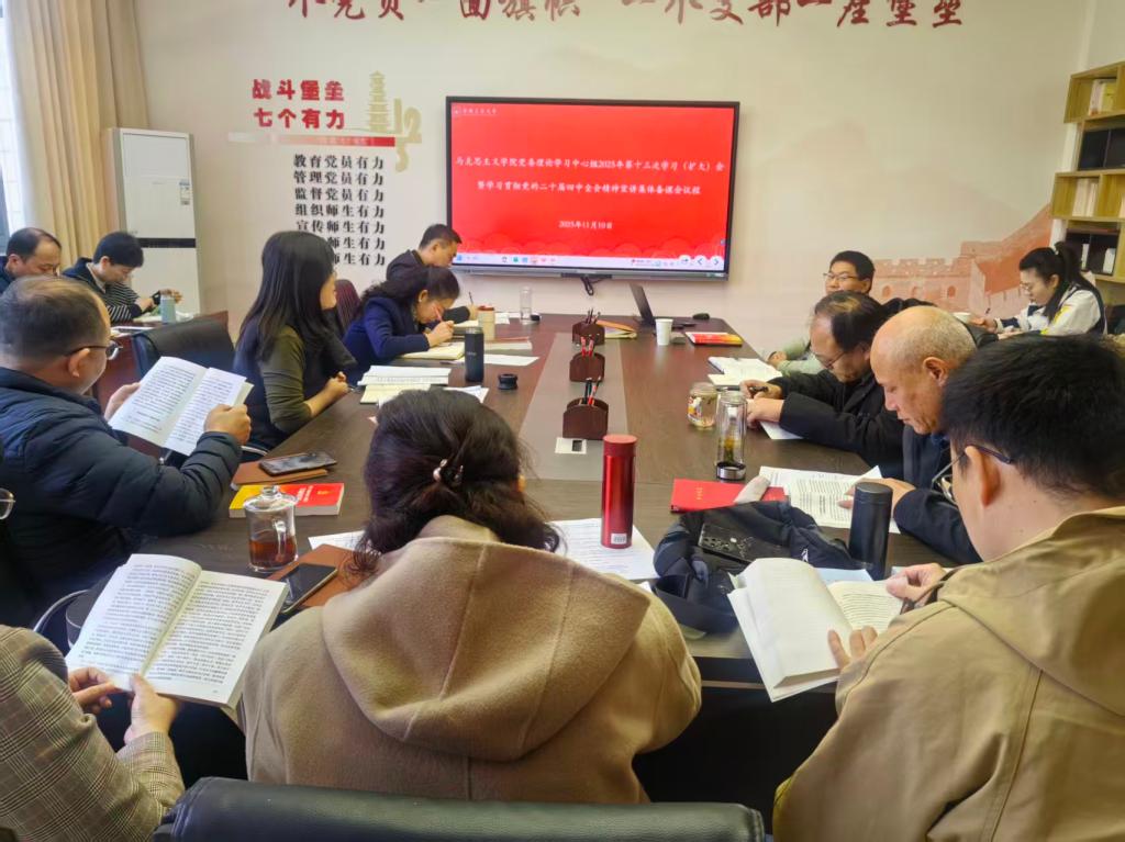 11月10日上午,马克思主义学院在综合楼324会议室召开党委理论学习中心组2025年第十三次学习(扩大)会暨学习贯彻党的二十届四中全会精神宣讲集体备课会。学院党委委员、支部书记、教研室主任、科级干部、宣讲团全体成员参加会议,会议由学院党委书记徐惠主持。