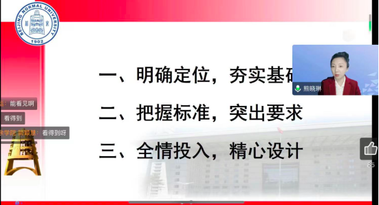 备课会上,北京师范大学马克思主义学院熊晓琳教授作了题为“讲好原理课的思考与实践” 专题辅导报告。熊晓琳教授从“明确定位,夯实基础”“把握标准,突出要求”“全情投入,精心设计”三个方面展开论述。并就如何讲好思政课重点围绕四个方面进行了阐述:一是深耕教材、讲清理论,二是创新方法、用活素材,三是全情投入、以情动人,四是严格自律、知行合一。熊晓琳教授结合自身教学实际,为大家介绍了建设一堂思政课“金课”的经验,即应做到“从一到六”。一是一个红心;二是科研和教学两条腿走路;三是追求讲政治、讲科学、讲故事的“三讲”;四是突出深耕教材,讲清理论、用活教材、创新方法四个基本要求;五是做到用心、用力、用眼、用脑、用情五位一体;六是把握教学设计的六个要素。最后,熊晓琳教授强调必须把讲好思政课当做一项事业来做,鼓励思政课教师要通过日常集体备课活动,将教材体系向教学体系转化,讲好有高度、有深度、有情怀、有温度的思政理论课。