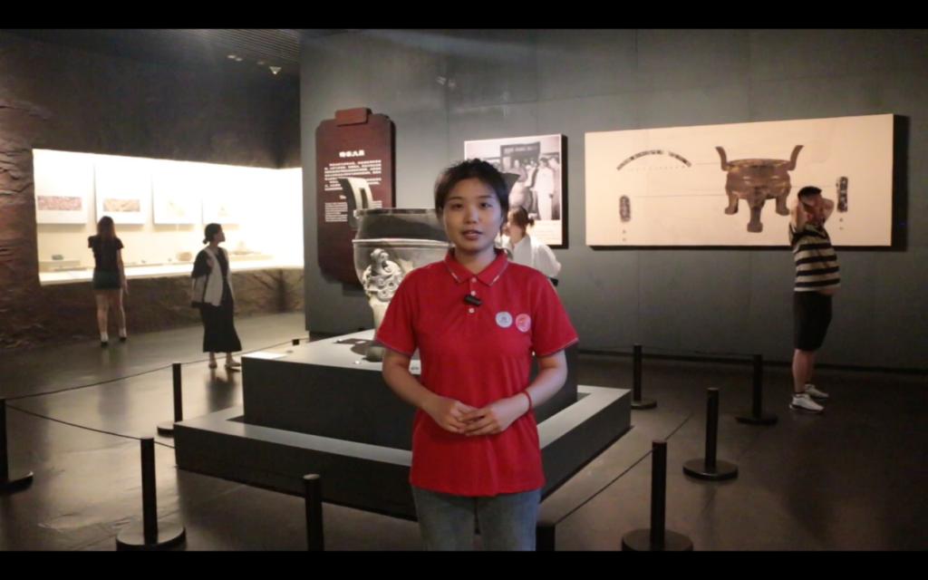 图为实践队成员在安徽博物院里讲解铸刻大鼎的故事