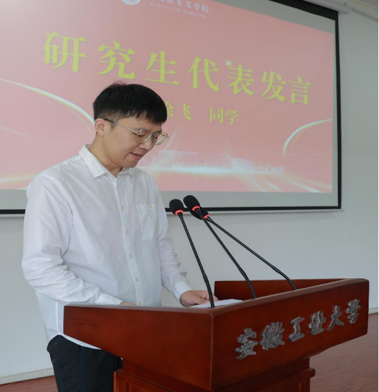 在高年级学生代表发言中,2022级研究生徐飞同学向学弟学妹们分享了自己学习和生活的感悟,他表示,作为马院学子,我们要在马信马,在马学马,在马行马。并给2024级新生三点建议:规划先行,把握时间;勤学不辍,勇于探索;自律为基,持之以恒。