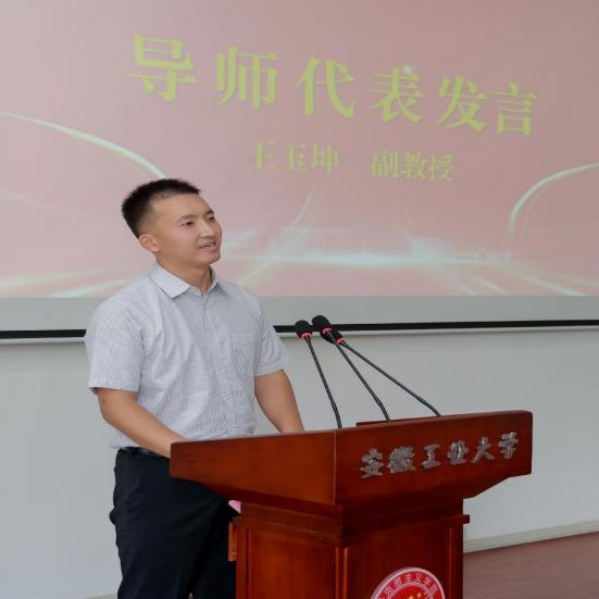 在导师代表发言中,王玉坤老师首先对2024级新生表示热烈欢迎,并简要介绍了学院和马克思主义理论专业的基本情况和发展历程。接着,他鼓励同学们因人而异进行专业规划,虚心向学院各位老师请教,不断登上学术素养的新台阶。最后他希望同学们在新征程上,以“直挂云帆济沧海”的勇气续写新的篇章。