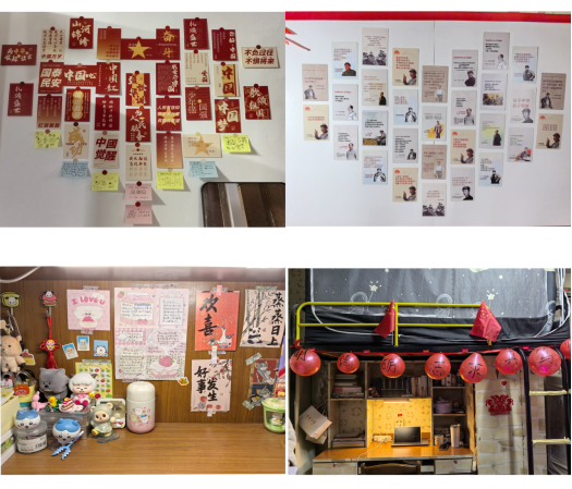 活动期间,各参赛宿舍紧扣“红色文化”核心主题,将理论认同与创意实践深度融合,精心打造特色宿舍文化展示。既体现了整洁规范的宿舍管理,又展现了富有创意的宿舍文化与团结协作的精神风貌。