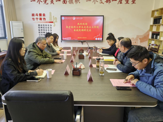 11月25日上午,南京医科大学马克思主义学院副院长陶林,“习近平新时代中国特色社会主义思想概论”(以下简称“新思想概论”)教研室主任任文峰以及教师代表文阡箫、王利利一行四人到访我院调研交流。学院院长郑洁,副院长倪松根,“新思想”教研室党支部书记戴少刚以及青年教师金雅、程权杰参加座谈会。