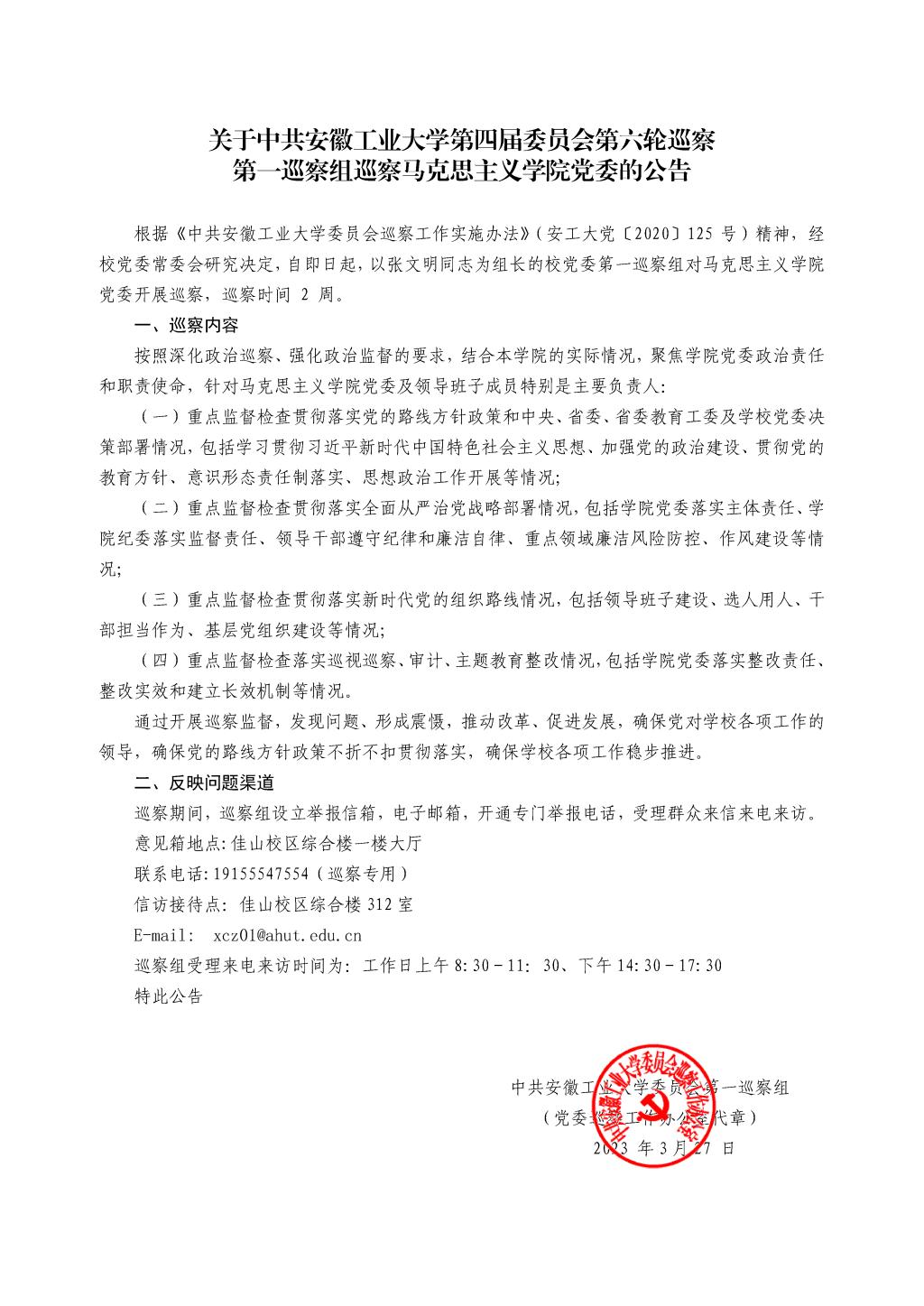 关于中共安徽工业大学第四届委员会第六轮巡察第一巡察组巡察马克思主义学院党委的公告