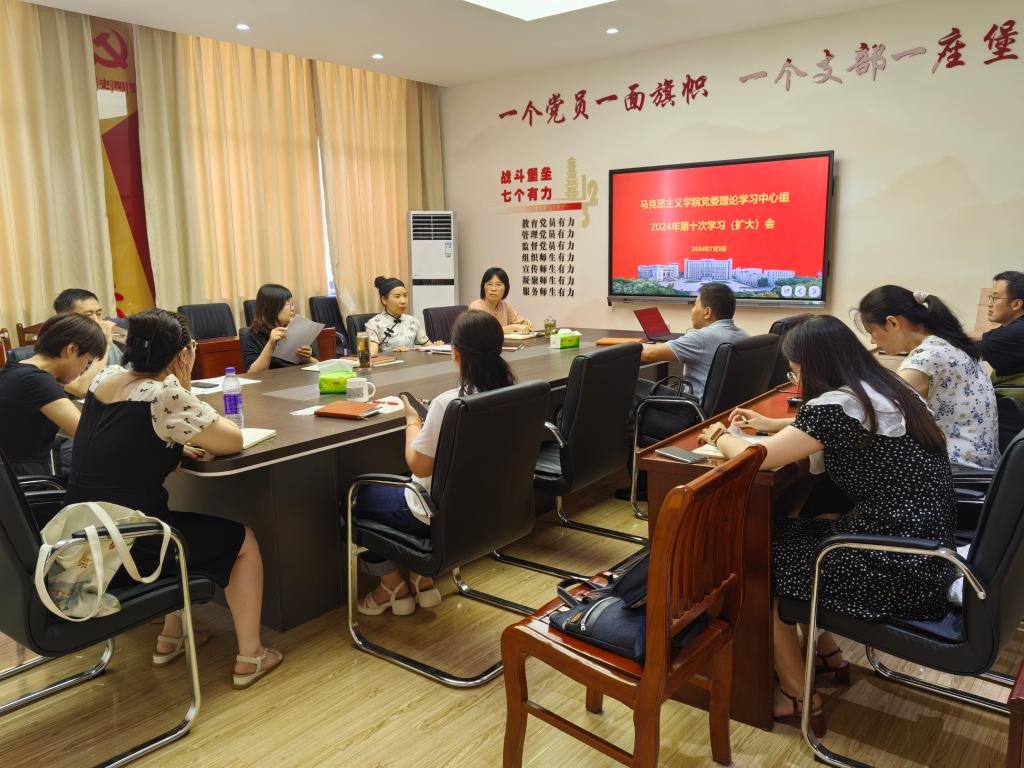 7月5日上午,马克思主义学院在综合楼324会议室召开2024年党委理论学习中心组第十次学习(扩大)会。学院党委委员、党支部书记、科级干部参加会议。会议由学院党委书记徐惠主持。