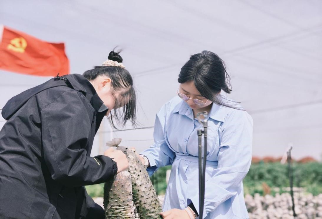 实践躬行强本领。在劳动教育环节,师生们深入木耳种植园区,与农户共同参与菌棒搬运、木耳采摘及分拣工作。通过亲身实践,同学们不仅掌握了木耳种植的基本技术,更体会到农业生产的艰辛与智慧。马克思主义学院研究生党员任良美表示:“劳动教育让我们走出课堂,真正理解了‘一粥一饭当思来之不易’。作为新时代青年,既要学好理论知识,更需扎根大地、服务社会。”