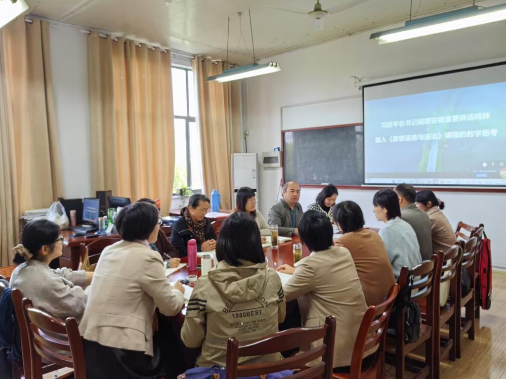 徐惠总结发言时强调,深入学习领会习近平总书记考察安徽重要讲话精神是思政课教师当前的重点任务。老师们要把学习此次重要讲话精神与学习党的二十届三中全会精神、全国教育大会精神结合起来,深学细悟,结合经典著作、前沿问题及学生特点,将讲话精神及时有效融入《德法》课的教学,切实提升教学效果。