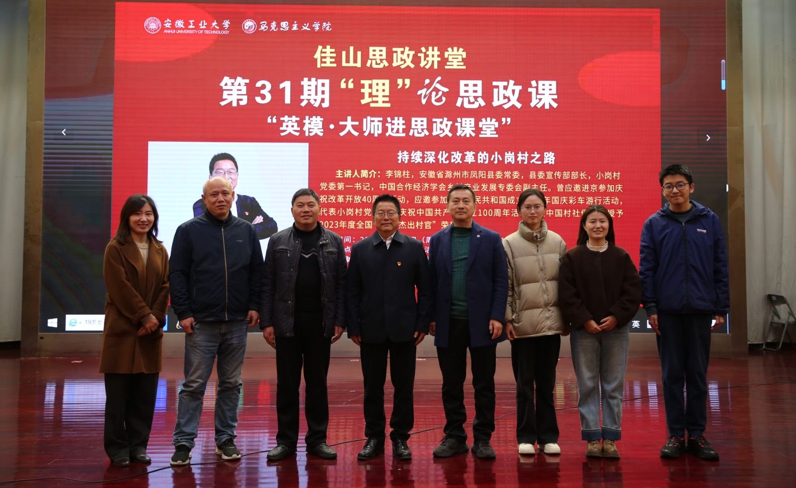 本次活动邀请中共凤阳县委常委、宣传部部长,小岗村党委第一书记李锦柱做客讲堂,走进“毛泽东思想和中国特色社会主义理论体系概论”课堂,与教研室杨蓉等老师开展“双师”教学。林忠心代表学院为李锦柱颁发聘书,正式聘任其为“校外兼职思政课教师”。