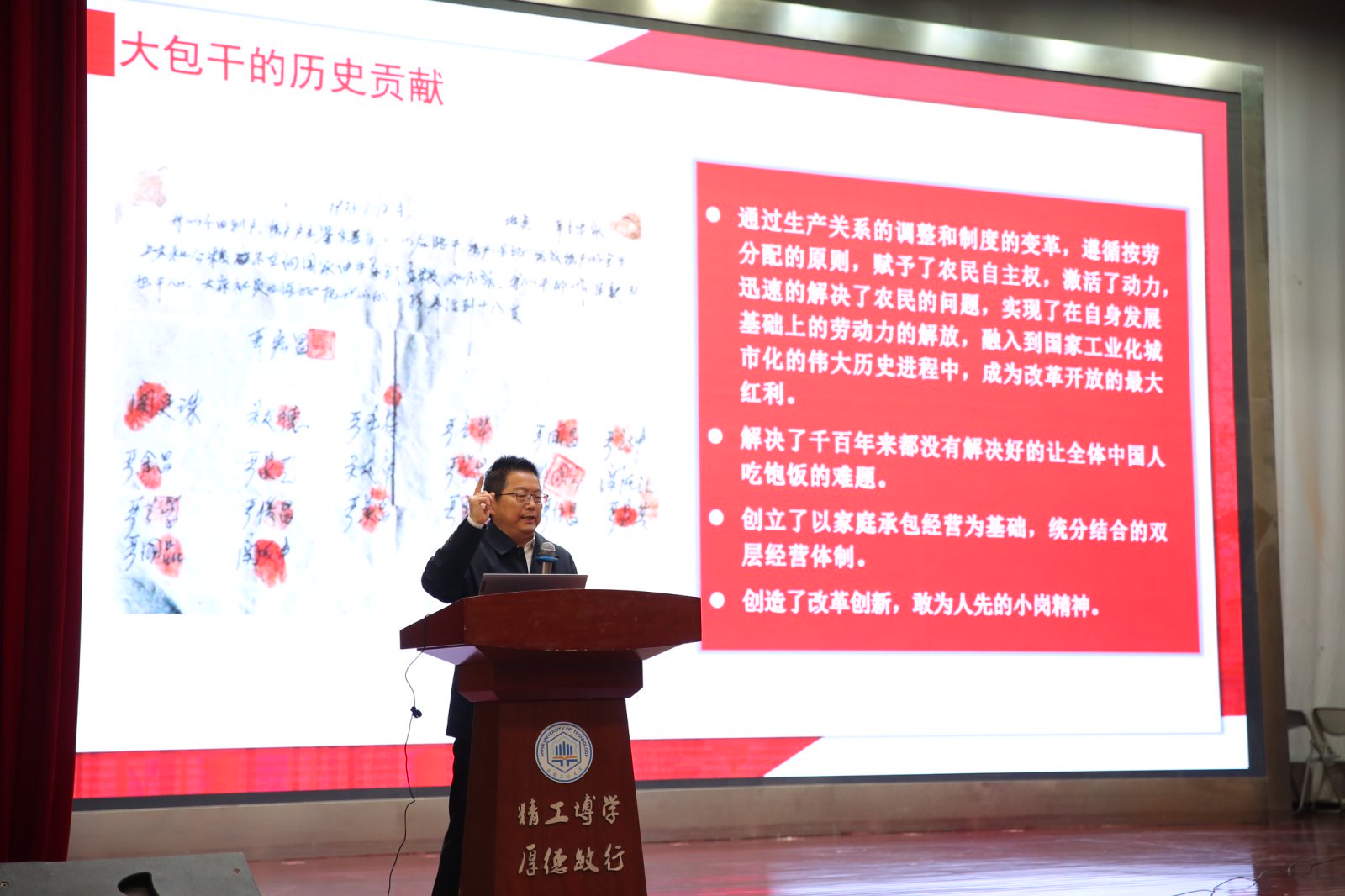 报告会在师生中引起强烈反响,同学们纷纷表示对小岗村“小岗”精神有了更深刻认识,对改革开放精神和辉煌历程有了更深入理解,对全面深化改革和进一步全面深化改革有了更深入的思考。开展“英模大师进思政课堂”探索“双师”教学,既是对改革开放精神的传承,更是对新时代青年的动员令,鼓励学生将个人成长融入国家战略,在乡村振兴、科技创新等领域践行“小岗”精神,在强国建设、民族复兴伟业中展现青春作为、贡献青春力量。