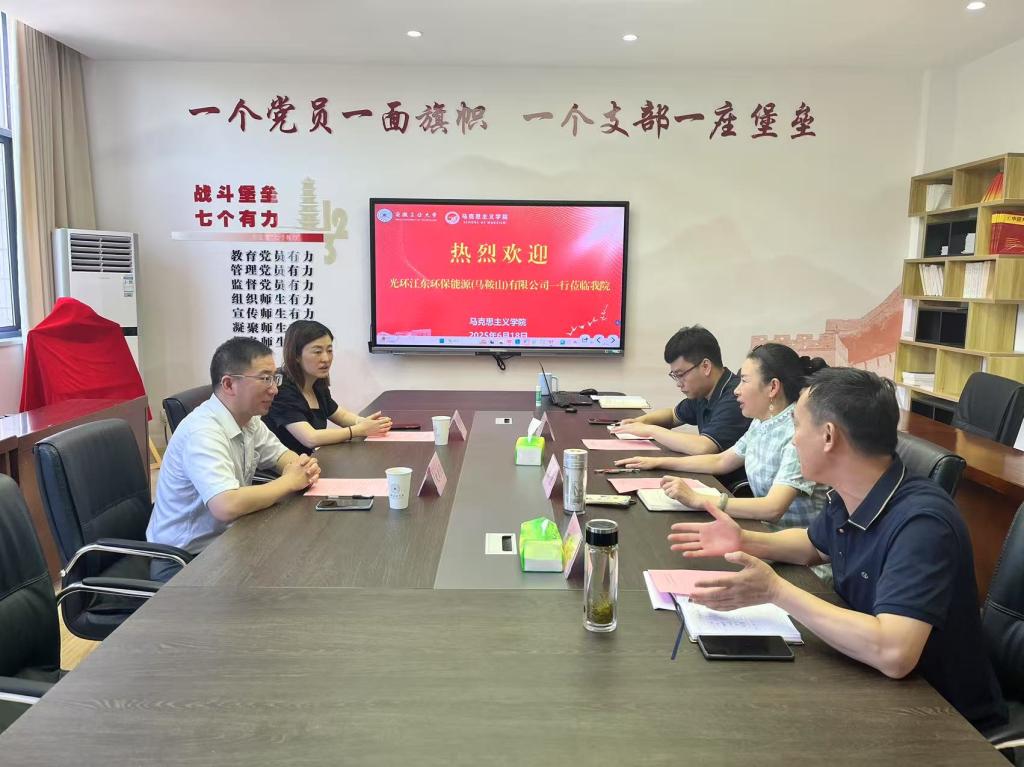 为积极推动“大思政课”建设,进一步探索思政小课堂与社会大课堂相结合方式与路径,不断丰富思政课教学内容。6月18日,我院与光环江东环保能源(马鞍山)有限公司举行教育部、生态环境部美丽中国专题“大思政课”实践教学基地建设交流会,并举行授牌仪式。光环江东环保能源(马鞍山)有限公司总经理助理史武元、综合部经理李卉,马克思主义学院院长郑洁、副院长林忠心、“思政课社会实践”教研室主任邱浩等参加会议。副院长林忠心主持会议。