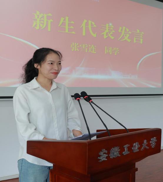 在新生代表发言中,2024级研究生张雪连同学与老师同学们分享了自己备考时与安徽工业大学马克思主义学院相遇相知的小故事。面对研究生生活,她与大家分享了三点感受,一是适应角色转换,二是加强专业认同,三是明确研究目标,并代表全体新生表示要沉下心来钻研学术,实现由“学习者”到“研究者”的身份转变。
