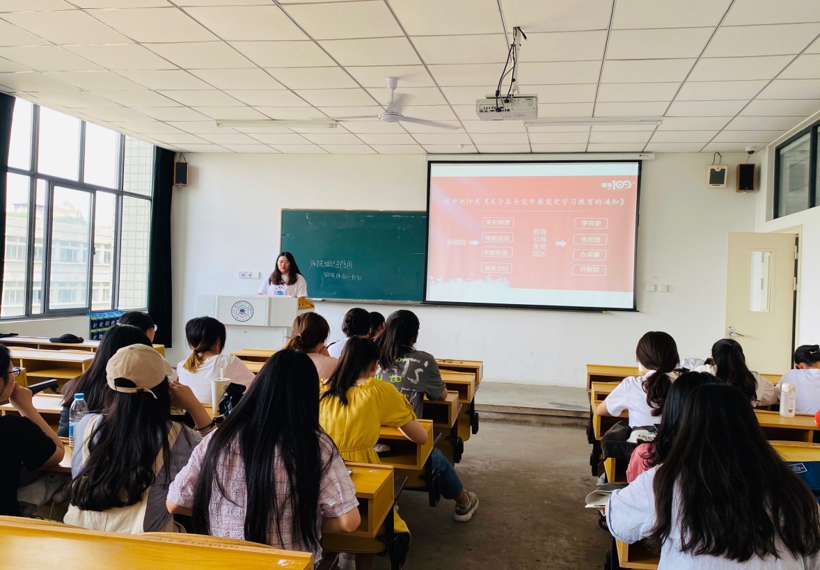 为深入学习贯彻习近平新时代中国特色社会主义思想和习近平总书记在党史学习教育动员大会上的重要讲话精神,6月8日,在佳山校区教一414教室,马克思主义学院研究生党史学习教育理论宣讲队成员彭菊萍为外国语学院2019级和2020级学生骨干,进行了主题为《百年大党与百年巨变——跨越时空看中国共产党与中国社会发展进步》的党史教育理论宣讲。