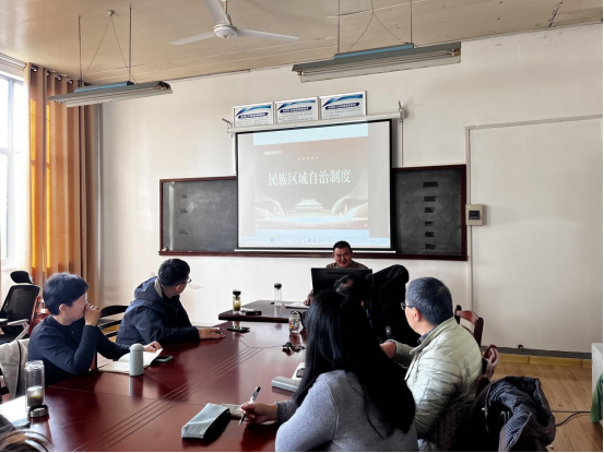 李春雨老师以《民族区域自治制度》为主题开展教学展示,从 “民族与民族识别的理论基础”“民族区域自治制度是中国新民主主义革命历史进程中的正确选择”“我国民族区域自治制度的核心内涵与实践特征”“新时代铸牢中华民族共同体意识的实践路径” 四个维度,系统梳理了专题授课逻辑,详细分享了自己的教学设计思路、重难点突破方法及课堂互动技巧。展示内容详实、逻辑清晰,为全体教师提供了可借鉴的教学范例。