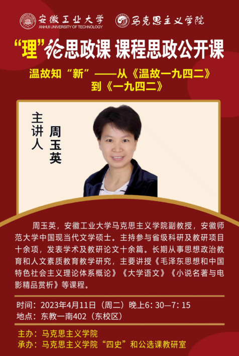 主讲人物介绍:周玉英,安徽工业大学马克思主义学院副教授,安徽师范大学中国现当代文学硕士。主持参与省级科研及教研项目十余项,发表学术及教研论文十余篇。长期从事思想政治教育和人文素质教育教学研究,主要讲授《毛泽东思想和中国特色社会主义理论体系概论》《大学语文》《小说名著与电影精品赏析》等课程。
