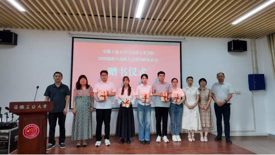 在为新生代表赠书环节,学院党委书记徐惠、院长郑洁、学院党委副书记、纪委书记、副院长林忠心、副院长宫晓虹、副院长倪松根分别为五名新生代表赠送《习近平著作选读》。
