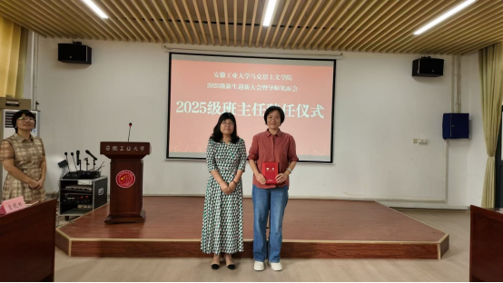 在2025级班主任聘任环节,学院党委书记徐惠为2025级班主任庄新霞老师颁发聘书。